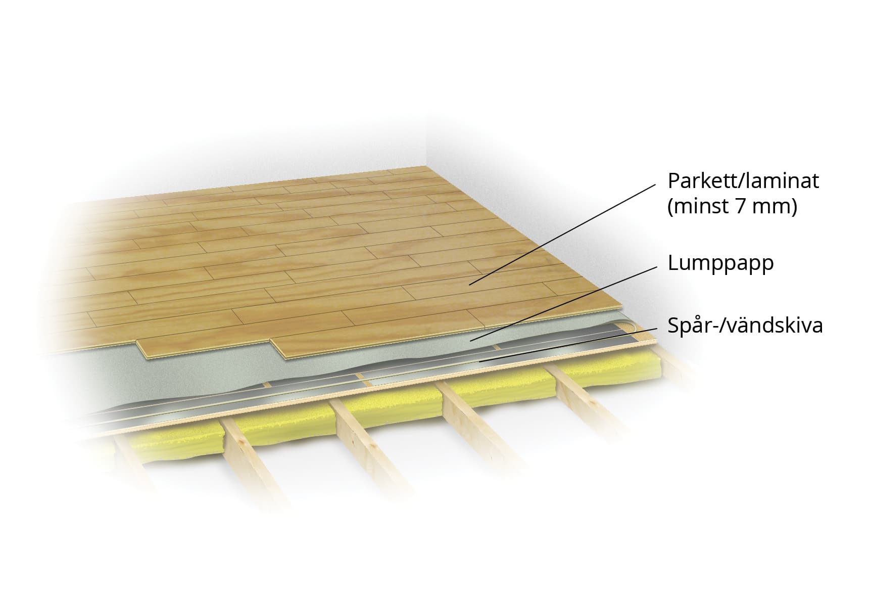 Laminat- eller Parkettgolv (av minst 7 mm tjocklek), monteras löst flytande ovanpå spårskivorna i samma riktning som dessa, alltså tvärs underliggande reglar. Lägg först en lumppapp ovanpå golvvärmeinstallationen. Föreskrivs ångspärr, skall denna placeras enligt ytskiktets tillverkningsanvsining. Se till att ytskiktets fogar i möjligaste mån förskjuts i förhållande till undergolvets.