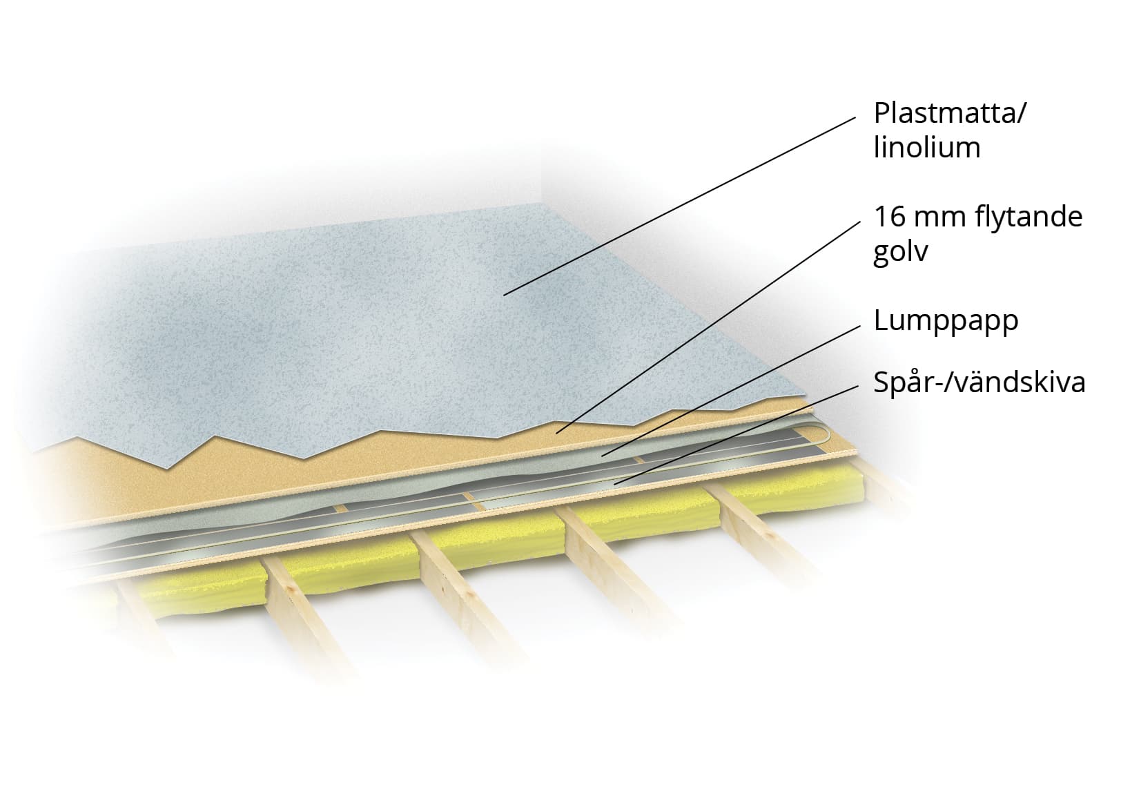 När plast- eller linoleummatta används som ytskikt, skall Spånskivemellangolv av minst 16 mm användas. Detta skall läggas löst flytande med en lumppapp mellan spårskivorna och det flytande golvet (se bild nedan). Byggelits Flytande golv tillverkas enligt kvalitet P2. Mellangolvskivorna läggs med minst 200 mm förskjutna kortskarvar och med en rörelsemån på 10 mm längs alla väggar och fasta föremål. Mellangolvet limmas i not och fjäder med PVAc-lim klass D2, t.ex. Cascol Indoor 3304 eller motsvarande. Limmängden ska vara så riklig att ett mindre överskott pressas fram vid monteringen. Limöverskottet torkas sen bort. Undvik i möjligaste mån att få det flytande golvets längdskarvar rakt ovanför spårskivans längdskarvar. Förskjut det flytande golvets kortskarvar med minst 100 mm i förhållande till de underliggande spårskivornas kortskarvar. Före mattläggning skall vid behov alla skivfogar slipas. Undvik att använda spackel, då fukten i spacklet sugs upp och kan bli kvar i skivan ett tag efter att spackelytan torkat. Den kvarvarande fukten kan, om den blir kvar under en tät matta, påverka golvets planhet negativt.