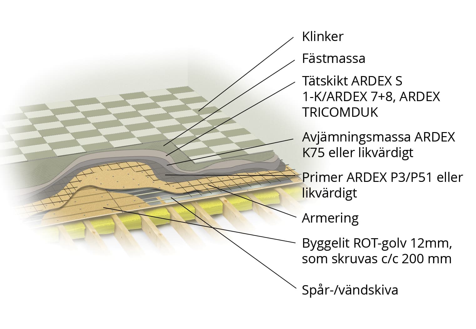 Keramisk beklädnad av golvet kräver ett tätare regelavstånd. Reglarnas avstånd skall då vara maximalt 300 mm c/c. Konstruktionen skall utföras efter rekommenderad branschstandard.