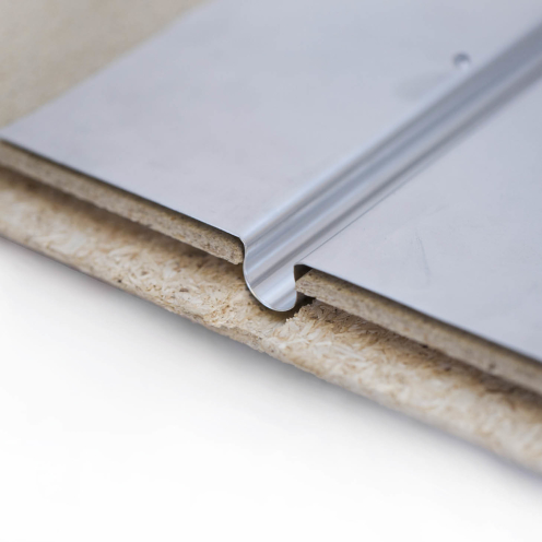 För att börja monteringen, använd en vändskiva som vid behov kapas och längdanpassas och monteras längs med reglarna. Lämna en rörelsefog mot alla väggar och begränsningar. Efterföljande spontade spårskivor monteras tvärs över reglarna, och kortfogarna förskjuts i förhållande till varandra i närliggande rader. Om de hamnar mellan samma regelpar, måste avståndet mellan kortfogarna vara minst 200 mm.