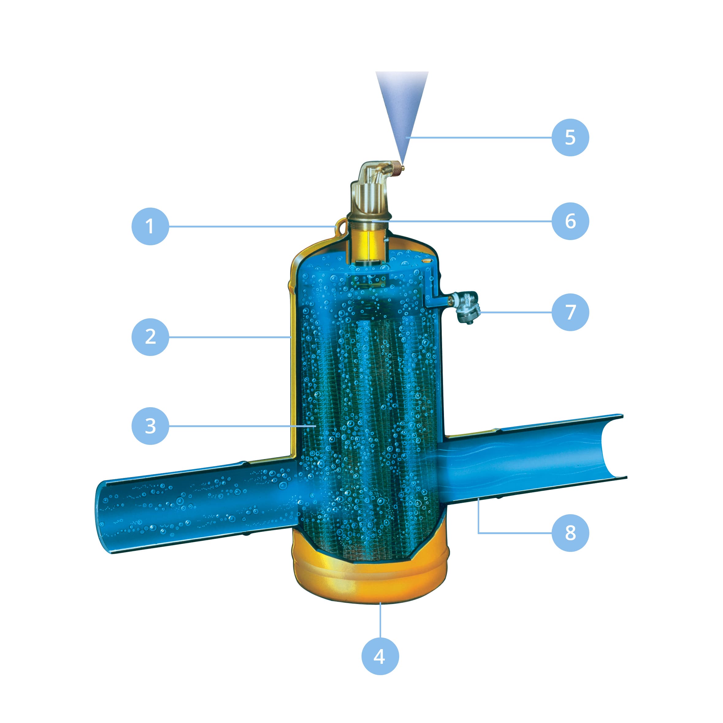 SpiroVent luftavskiljare för mikrobubblor placeras i vätskeflödet och avlägsnar kontinuerligt fri luft och mikrobubblor ur systemvätskan.